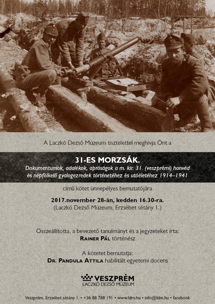 Ma délután, 16.30-kor kerül sor a Laczkó Dezső Múzeum gondozásában megjelenő 31-ES MORZSÁK. Dokumentumok, adalékok, apróságok a m. kir. 31. (veszprémi) honvéd és népfölkelő gyalogezredek történetéhez és utóéletéhez 1914–1941 című kötet bemutatójára. A kötetet összeállította Rainer Pál a Laczkó Dezső Múzeum történésze. A művet ismerteti Dr. Pandula Attila habilitált egyetemi docens. A rendezvény ingyenes.