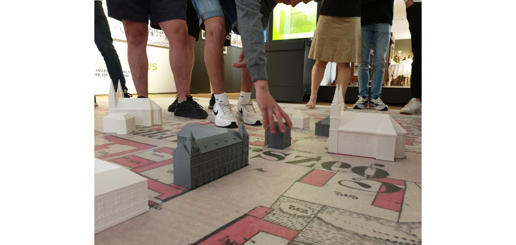 A kiállítás belső terein a letisztultság uralkodik. Többnyire minimál elemek, átgondolt színpaletta, amelyben a szürke, a zöld, a sárga és a narancs uralkodik. A legeltaláltabb vitrin a megyeteremben álló olyan installáció, amely a padló felé leszűkülve, mint egy óriási körzőtű a szóban forgó városra irányítja a figyelmet.