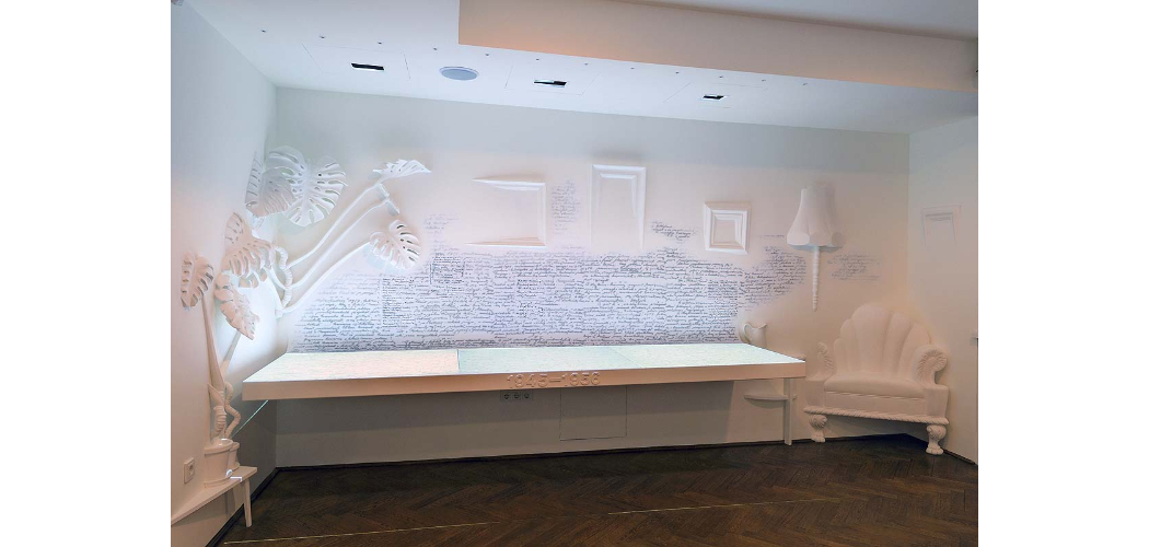 A bemutatott eredeti használati tárgyak és a korszakot idéző illusztrációk mellett a kiállítás hangulatát a termek sajátos kialakítása adja. A hiányzó tárgyakat és az egykori családi otthon melegét hófehér reliefek idézik, valamint Nagy Imre magyar, német, orosz nyelvű kézírásainak rekonstrukciói. A mondatfolyamokká alakuló sorok fogják össze a falba olvadó teljesen hétköznapi élet reliktumait. Esernyőtartó, szobanövény, szekrény, fotel, ágy 3D-s sziluettje lép ki a fal síkjából. Ott is vannak, és nem is, helyet foglalnak és nem is. Mintha leplet húznának rájuk, ahogy a Kádár-korszak emlékezete is próbált pókhálót szőni 1956 emlékezete köré. És ahogyan itt sem, akkor sem sikerült. 1989 hangulata egy pillanat alatt törte meg a csendet, húzta le a leplet a zárójelbe tett bűnökről.