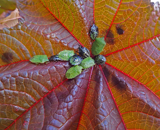 Zöld vándorpoloska lárvái és imágói ricinus levelén (Bodor János felvétele)