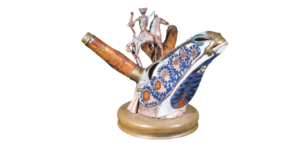 Turi Endre: Szarvastorzó, 1985, rekeszzománc borítású vörösréz körplasztika, 32x42 cm