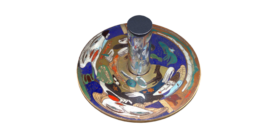 Turi Endre: Étkező család, 1988, vörösréz, rekeszzománc, anamorfózis, átmérő: 50 cm