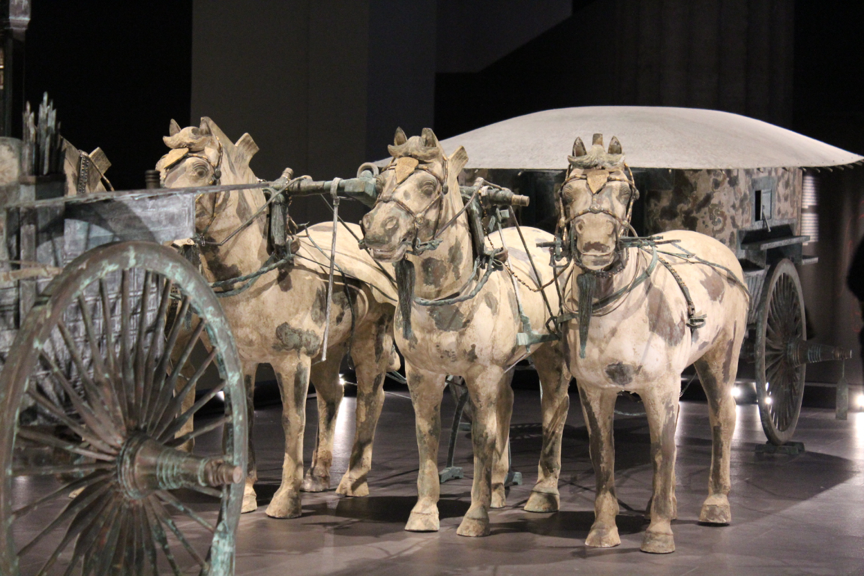 A kiállítótérbe lépve a látogató első benyomása a túlvilági létbe csöppenés. A két első teremrészt követő drámai megvilágításban és emelt pódiumon megjelenő monumentális négylovas nyitott kocsi álló hajtójával lehetőséget ad arra, hogy a néző ne csupán frontálisan, hanem a térben mozogva érzékelje a figurák egyediségét. Ez folytatódik a következő nagyobb térben is, ahol a tíz eredeti agyagkatonát tekinthetjük meg. A testtartások, frizurák, arcvonások finom különbségei valóban alátámasztják azt a régészeti megállapítást, mely szerint a hadsereg figurái nem sorozatgyártott sablonok, hanem variált típusok. A látvány fókuszú sétáló hídról pedig nagyléptékben is megtekinthetjük a nyitott kocsit és hajtóját, a lovakat és a másik oldalon helyet foglaló katonákat.