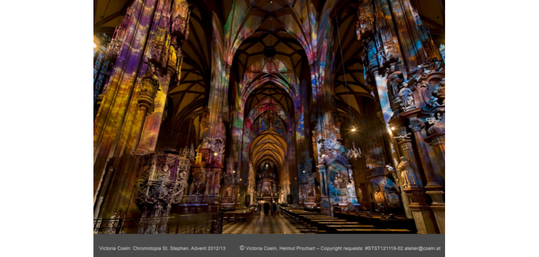 Erwin Wurmhoz hasonlóan a fényinstallációiról híres Victoria Coeln is többször kapott lehetőséget például a Wiener Konzerthaus mellett a Stephansdom-ban is kiállítani. 2012 adventjén – egészen 2013. január közepéig – „Chromotopia St. Stephan” című fényinstallációját csodálhatták a Dom látogatói. A fényjáték egészen különleges hangulatot kölcsönzött a katedrálisnak, különösen az esti órákban, amikor az oszlopszentek „új életre keltek” a fények és színek kavalkádjában. Az installáció utalás a János evangéliumában leírtakra is: „Jézus ismét megszólalt, és ezt mondta nekik: „Én vagyok a világ világossága: aki engem követ, nem jár sötétségben, hanem övé lesz az élet világossága.”