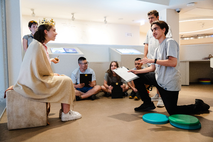 A rövid játékismertető után megválasztunk egy királyt, aki a közösen épített trónra ül, a többiek felsorakoznak a termen kívül. A hoppmester (a múzeumpedagógus) bejelenti őket, így már alattvalói szerepben lépnek a képzelt királyi udvarba.