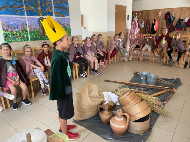 Az igazmese eljátszása előtt Az élet dolgai Besenyszögön kiállítás Aratástól kenyérsütésig kiállításrész megtekintése történik.