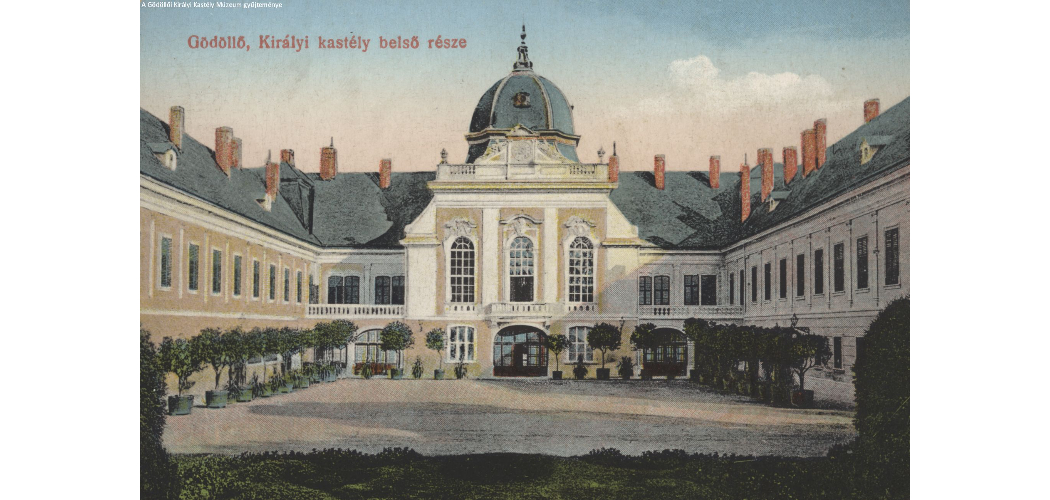 A kastély díszudvara. Fotó: Erdélyi Mór, 1895. Színezett képeslap, 1935. (A Gödöllői Királyi Kastély Múzeum gyűjteményéből)