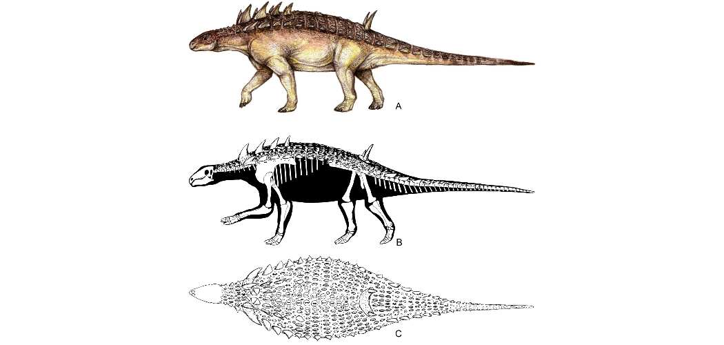 Az ankylosauria dinoszauruszok testét több sorban elhelyezkedő páncélelemek és tüskék borították, melyek kiemelkedő szerepet tölthettek be a ragadozók elleni védekezésben (Pecsics Tibor illusztrációja)