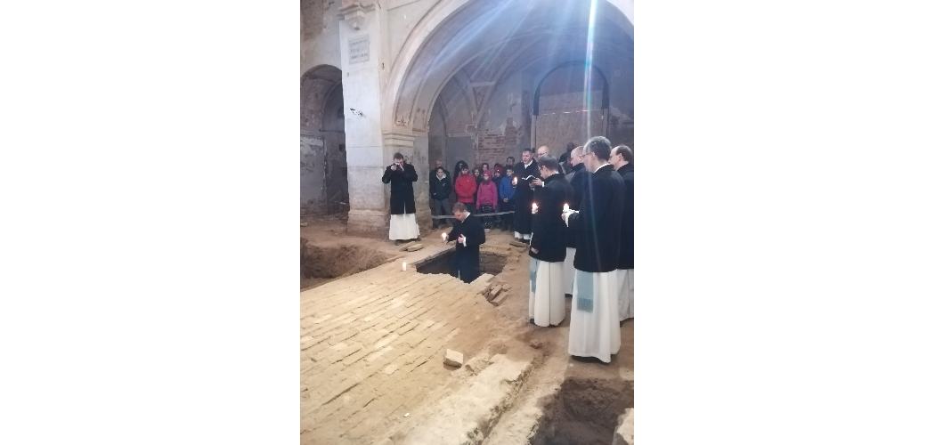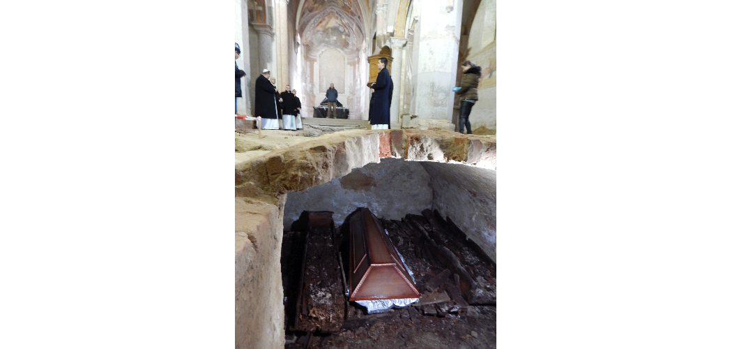 A munkálatok során váratlan leletre is bukkantak, méghozzá a templom főhajójának közepén. Noha írásos említés nem volt róla, a padozat alatt egy barokk boltíves sírkamrát találtak. Ebben két egyházi személy, három előkelő hölgy és egy gyermek földi maradványaira leltek. Az egyik egyházi személyt sikerült azonosítani a koporsóra vésett felirat alapján: ő az 1757-ben elhunyt Nolbek Rafael prépost. Szokatlan módon a csontok nagy része elporladt, de maradtak fa- és textilmaradványok a sírkamrában. A préposti koporsóból stóla, birétum (egyházi fejfedő), bőrkesztyű, lábbelifoszlány, illetve egy rózsafüzér került elő. A régészeti bemutató után egy nem mindennapi élményben volt része azoknak, akik a templomban maradtak elmerengve a régi korok eseményein és elidőztek a freskókat tanulmányozva. Nolbek Rafael préposttól, illetve a sírhelyben talált személyektől egyházi zártkörű gyászszertartáson vettek végső búcsút Fazakas Zoltán Márton csornai premontrei apát és a rend tagjai. A kriptában - annak lezárása előtt - elhelyeztek egy időkapszulát is.