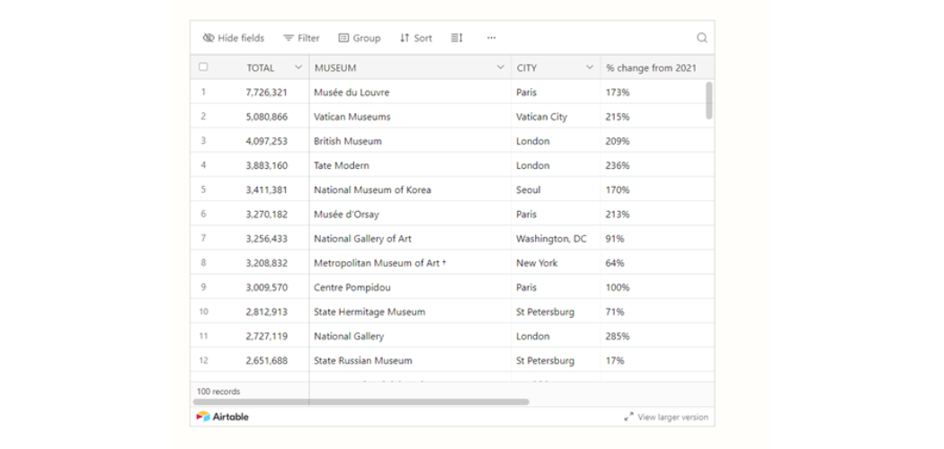 A leglátogatottabb művészeti múzeum ezúttal is a párizsi Louvre lett, 2022-ben mintegy 7,7 millió látogatóval. A következő helyen a Vatikáni Múzeum, majd a londoni British Múzeum, a Tate Modern és a szöuli Koreai Nemzeti Múzeum szerepel a listán. A 75. helyet foglalja el a budapesti Szépművészeti Múzeum. Az Art Newspaper látogatószám-felmérését évente végzik el, a 2022-es teljes jelentés itt olvasható.
