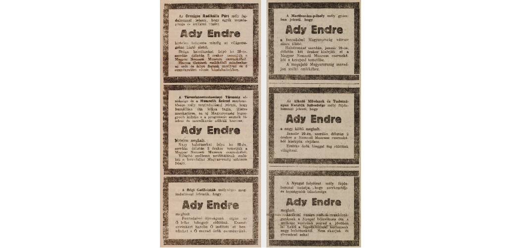 Ady Endre újságban is megjelent gyászjelentései (Világ. 1919. jan. 28. 24. sz., jan. 29. 25. sz.)
