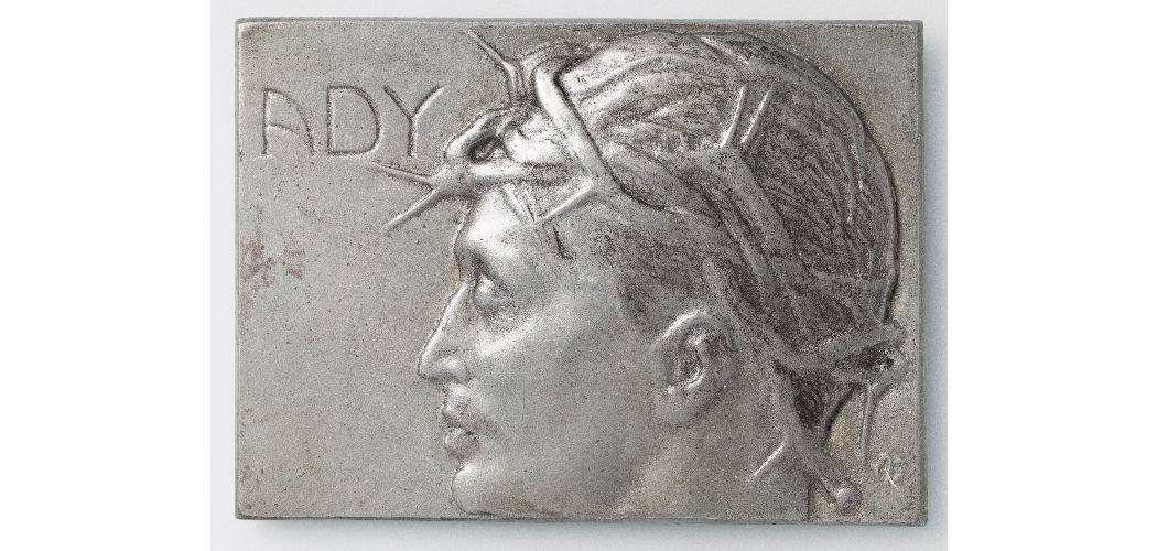 Ady töviskoszorúval egy valószínűleg 1919-ben készült hadifém emlékplaketten (MNM Éremtár)
