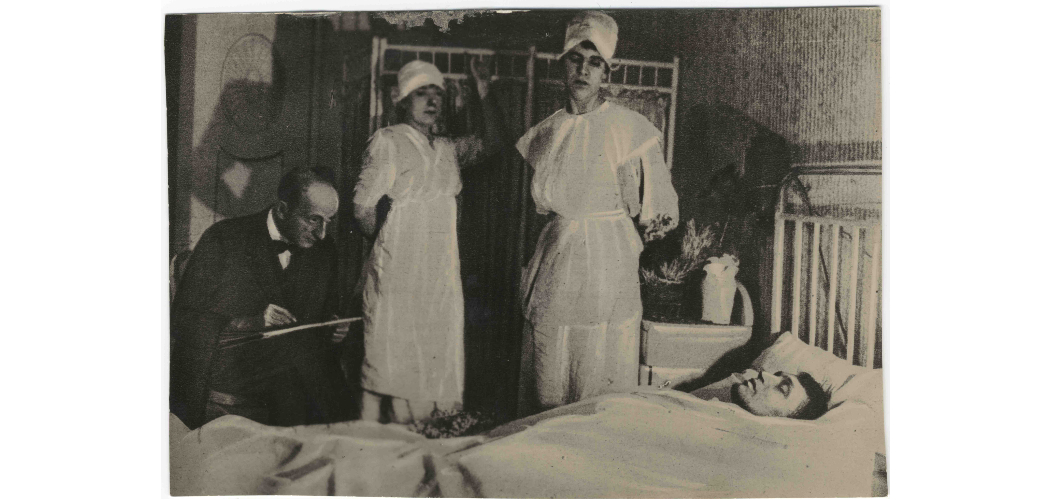 Csoportkép – balról jobbra: Kober Leó festőművész a két ápolónővel, akik közül az egyik Papp Márta, a másik Róza nővér – Ady Endre halottas ágyánál, 1919. január 27. (Fotó: Szőnyi Lajos – MNM Történeti Fényképtár)