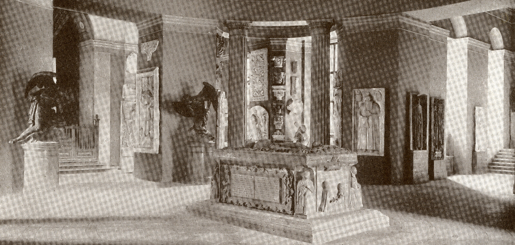 A nemzet nagy halottjainak ravatalozóhelye: a Nemzeti Múzeum épületének előcsarnoka (Forrás: Lechner Jenő: A Magyar Nemzeti Múzeum épülete 1836-1926. Bp., 1927. 42-43. oldalak között)