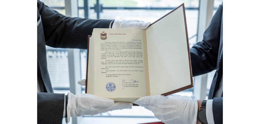 Az arab nyelvű Biblia a szentföldi kusztódia felajánlása. A könyv a betlehemi Születés Templomának ajándéka.