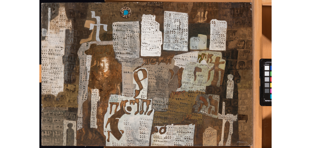 Ország Lili (1926–1978): Vízió / Prágai zsidó temető, 1968, olaj, bronzfesték, farostlemez; 50,5×60 cm