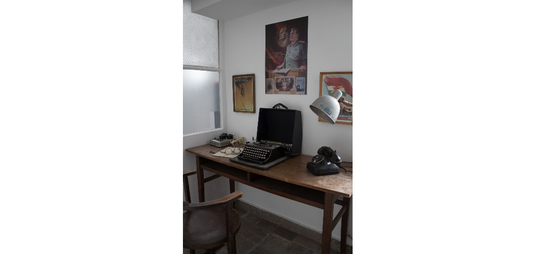 A fél emeleti folyosón lévő ügyeletes tiszt szobáját a korai szocializmus tárgyaival rendezték be, a helyiségben rádió szól, híreket mondanak: „Kedden délután vörös és nemzeti színű zászlók alatt esztergályosok, martinászok, kovácsok, szövőnők, hajósok, háziasszonyok, a XXI. kerület dolgozó népe a csepeli sportcsarnokba vonult, hogy meghallgassa Mekis József elvtársnak, a Vas- és Fémipari Szakszervezet elnökének, képviselőjelöltjüknek beszédét...” A dobogón sezlony, dohányzóasztal, olvasólámpa, teafőző edény, korabeli újságok és egy pisztolytáska. A szürkére festett és okkersárga hengerezett virágmintával dekorált ÜTI szobából kilépve juthat le a látogató megfelelő „ellenőrzést” követően a pinceszintre. A pincefolyosón egy textilgrafika fogadja a betérőt: egy géppisztolyos ávós néz szigorúan az ember szemébe.