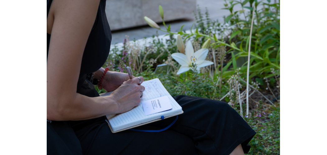 A programot meditatív kertmerülés egészítette ki, amelynek a Szépművészeti Múzeum belső udvara adott helyet. A kert növényeivel és formáival való kapcsolódást egy “meghívásokat” tartalmazó kártyacsomag segítette. A kertben megtapasztalt érzeteket vizualizációs gyakorlatok mentén összekapcsoltuk azokkal a művekkel, amelyeket a műhely résztvevői korábban választottak.