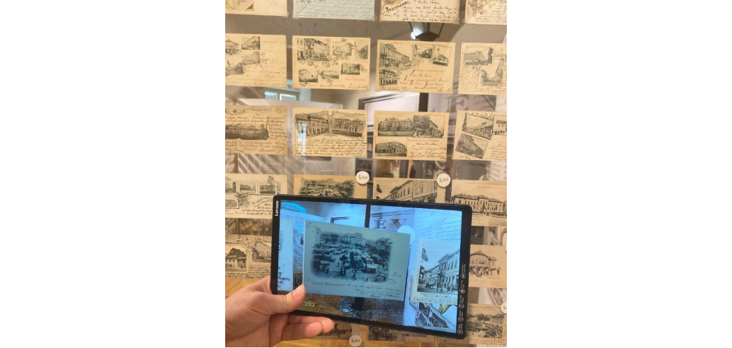 A képeslapok a "lapozható" üvegfelületeken mindkét oldalukat felfedik, és néhányuk a recepciónál kapott tablettel hangos híradóvá, kinagyított, mozgó életképpé varázsolható.