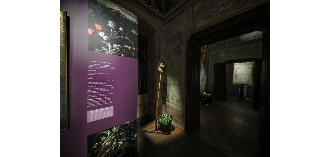 A kiállítás viszonylag kis alapterülete hamar körbejárható lenne. A látogató valamiért mégis azt érzi: nem szabad sietnie, különösen nem elsietnie! Vajon miért? A válasz talán a tárlat egyik fő szervező erejévé előlépő félhomályban keresendő. A kiállítás alaptónusa ugyanis egyfajta bizonytalan homályosság. Nem sötétség, nem feketeség, amely ma már bevett, sokszor szinte rutinszerű gyakorlatnak számít a kiállítástervezésnél – akár indokolt, akár nem —, hanem a kevés fény és a sok, nagyra növő árnyék. Néhány pontszerű reflektor kiemeli a freskók egy-egy részletét, másutt a szűkre szabott fénykörbe éppen csak beférő kép mellett a falon széles, félig sötét átmenet miatt kalandozik el a tekintet – hova is?