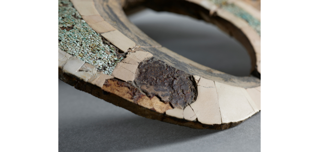 A türkizberakásokat szegélyező világos színű lemezekből álló borítás három különböző anyagból áll, amit a kémiai vizsgálatok is megerősítettek: a gyöngyházfényű fehér-világosszürke lemezek alabástromnak, a porózus tojáshéj színű lemezek pedig agyagkőnek bizonyultak. A sima világossárga lemezek anyagát nem lehetett bizonyossággal meghatározni, az anyag Raman-spektruma a fehér agyag-agyagkőben (kaolinban) előforduló anatáz jelenlétét mutatja. A vörösre színezett területek környezetüknél magasabb (esetenként tízszer akkora) vastartalma arra utalt, hogy színezőanyagként vasban gazdag földfestéket használtak. A feketére festett szemöldökök jelentős kálium, kalcium és kén tartalma hamu vagy faszén tartalmú színező anyagra utal.