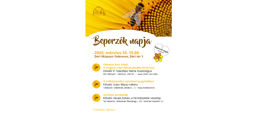 14 órától egy osztályt várnak, majd 15 órától előadások és mini kiállítás (a Múzeum hagyományos méhészkedéshez kapcsolódó tárgyai) fogadják a látogatókat