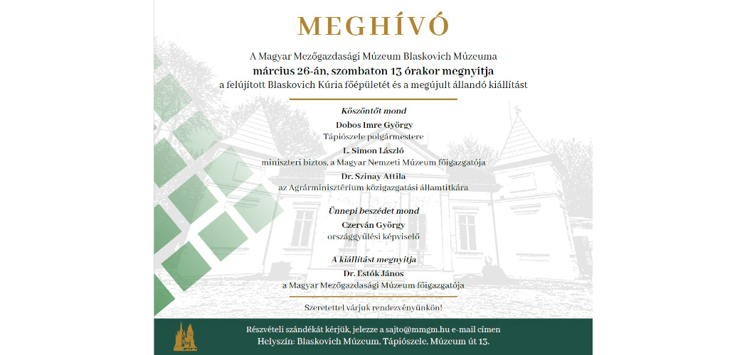 A Magyar Mezőgazdasági Múzeum Blaskovich Múzeuma 2022. március 26-án megnyitja a felújított Blaskovich Kúria főépületét és a megújult állandó kiállítást.