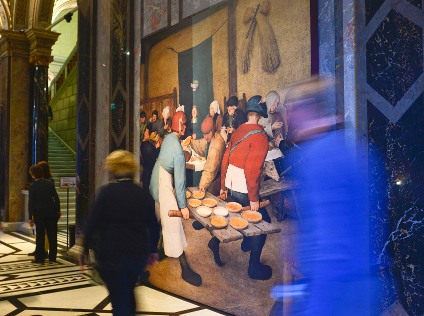 A kiállításhoz többletet adott, hogy az egyes termekben különböző érdekességekkel tették még izgalmasabbá az egyébként is gigantikus tárlatot: láthattunk korabeli cipőt, mely akár származhatna a szénásszekér parasztjainak lábáról, de a restaurálási folyamatok bemutatása is értékes adalékul szolgált. Az pedig külön öröm volt, hogy ottlétünk alatt számos magyar szót hallottunk, de németül, angolul, franciául és olaszul is folyt a diskurzus a képek előtt – Brueghel valóban mindenkié.