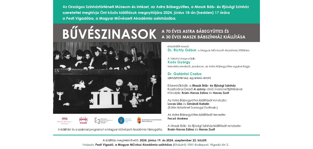 A tárlatot az Astra Bábegyüttes hagyományait továbbvivő Maszk Bábszínház harmincéves munkásságát összegző rész teszi teljessé. Az érdeklődők a kiállított bábokon keresztül fedezhetik fel a bibliai történetek, a komolyzenei művek, a szépirodalmi alkotások, a népmesék, a legendák és a cirkusz világát. Az Országos Színháztörténeti Múzeum és Intézet, az Astra Bábegyüttes, a Maszk Báb- és Ifjúsági Színház közös kiállítása 2024. június 18-án 17 órakor nyílik a Pesti Vigadóban.