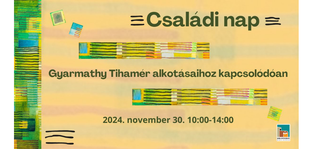2024. november 30-án 10 és 14 óra között ingyenes családi napra várja a Bibliamúzeum látogatóit a Gyarmathy Tihamér alkotásait bemutató, Egeknek egei – A gondolat festett terei című időszaki kiállításhoz kapcsolódóan. Többféle korosztálynak szóló, különleges programok: Giricz Máté festőművész, Gyarmathy Tihamér unokája, aki családi történetekkel fűszerezett beszélgetésre hívja a résztvevőket, művészetpedagógiai foglalkozás felnőtteknek, gyerekeknek pedig kézműves alkotófoglalkozás.