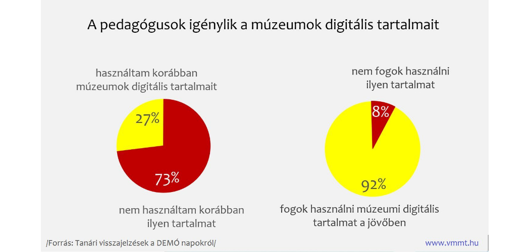- Az első és legfontosabb, hogy nagy igény van a tanárok részéről az oktatásban is hasznosítható digitális múzeumi tartalmakra. Felméréseinkből kiderült, hogy míg korábban – a pandémia, a digitális oktatás kényszerű bevezetése előtti idősszakban – a tanároknak csak 27%-a használt múzeumi digitális tartalmat, addig a jövőben – köszönhetően a DEMÓ napoknak is – már 92%-uk gondolja úgy, hogy ezeket a tartalmakat használni fogja a tanítás során. Ez egyben arra a kérdésre is választ ad, hogy a múzeumoknak kell-e a jövőben is készíteniük ilyen tartalmakat. A pandémia időszaka alatt elindult folyamatot, ha nem is feltétlen ugyanolyan intenzitással, de feltétlen folytatni kell!