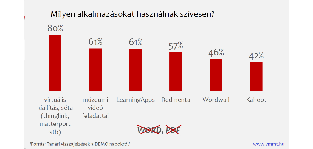 - Amit legtöbben néztek azok a különböző platformokon elkészített virtuális séták és kiállítások (pl. Thinglink, Matterport), valamint a múzeumok bemutatkozó kisfilmjei (elsősorban a Youtube-on). Szerették a játékos feladatmegoldásokat és a vetélkedőket is. A visszajelzésekben sokan kiemelték a Learning Apps tankockákat a játékos feladatmegoldás és a gyors visszajelzés miatt, valamint a Genially, Wordwall felületekre készült digitális feladatokat és a Kahoot vetélkedőket. A 2. alkalomnál kiugróan magas volt – valószínűleg a Totó játék miatt - a Redmenta népszerűsége. Általában azokat a felületeket szerették, amiket amúgy is használnak a tanítás során és ezért már ismerik őket.