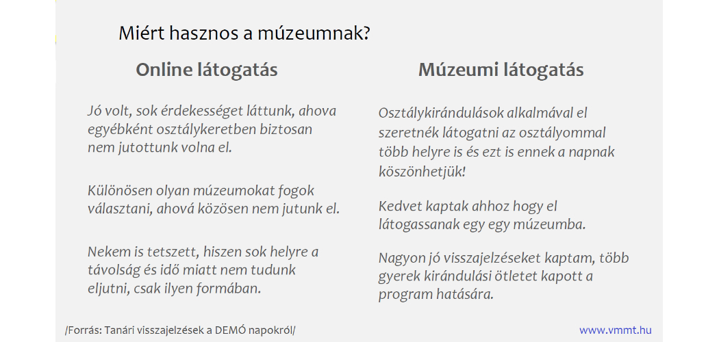 Folytatni kell az ilyen tartalmak előállítását már csak azért is, mert a digitális tartalmak a látogatószerzés egyik formája is lehet. Egyrészről a digitális tartalmakkal a múzeum megismertetheti magát, kiállításait, gyűjteményeit olyanokkal is, akik valamilyen ok, akadály miatt nem tudnak ellátogatni a múzeumba. De tökéletesen alkalmas arra is, hogy felkeltse az érdeklődést a múzeum valós meglátogatására. Több tanár is jelezte, hogy a DEMÓ napokon egy-egy múzeum feladata annyira megtetszett a diákoknak, hogy osztálykirándulás alkalmával elmennek majd oda.