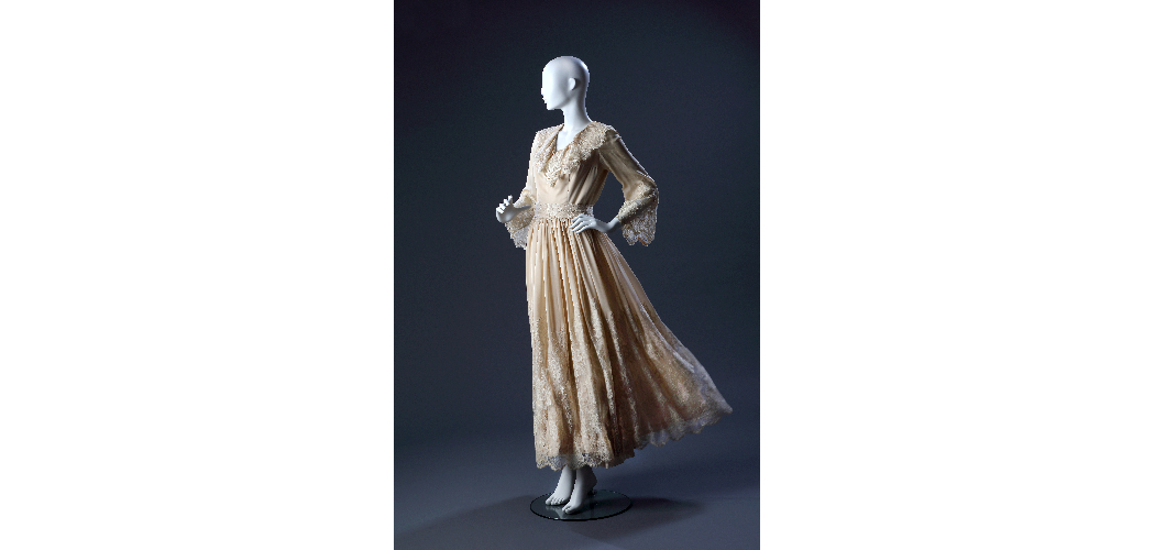 Alkalmi csipkeruha, selyem muszlinnal kombinált poliészter csipke, 1975. Gönczi Annamária újságírónő az esküvőjén viselte és máig megőrizte.
