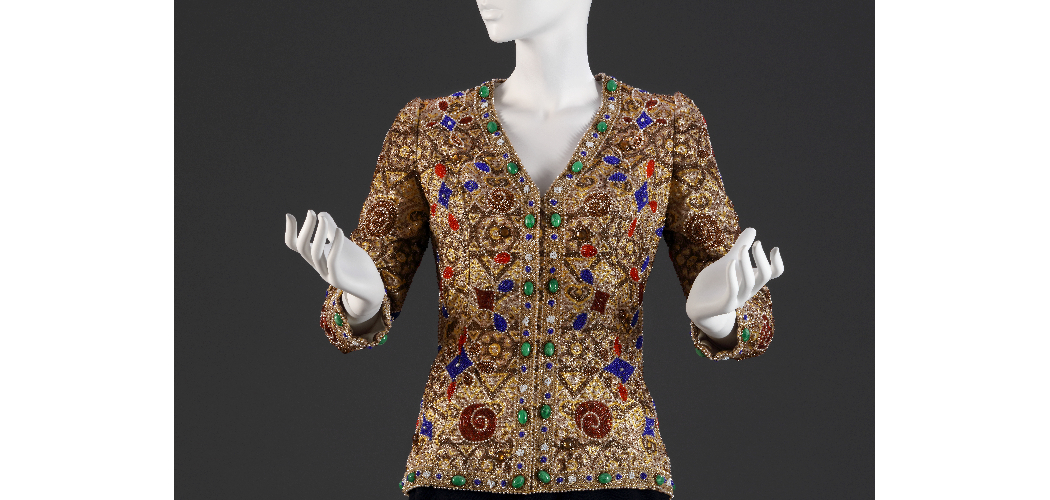 Ékszerkabát, lurex-viszkóz alapra üveg és teklagyöngyökkel készült kézi gyöngyhímzés, 1974. Az ékszerkardigánok divatját Yves Saint Laurent indította el, Rotschild Klára pedig megcsinálta a saját verzióját, mely haláláig az egyik legnépszerűbb kreációja volt. Magántulajdon
