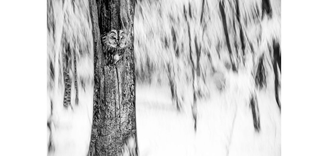 Az idei év természetfotója, egy macskabaglyot ábrázoló kép pedig a látszólagos egyszerűségével hódít. Igen, idén az év természetfotója a fotózás hajnalát idéző fekete-fehér alkotás: Nagy Bertold az éles madár és a tudatosan ráexponált elmosódott háttér egybegyúrásával visz minket a téli erdő frissen esett hótól lehajló faágai alá.
