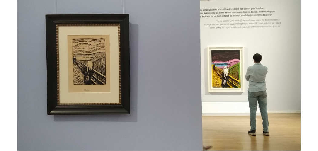 Részlet a kiállításból. Előtérben: Edvard Munch: A sikoly, 1895 (litográfia, Courtesy of Morten Zondag Kunstformidling, Norway), háttérben: Andy Warhol: A sikoly, 1984 (szitanyomat, The Savings Bank Foundation DNB / Haugar Art Museum)
