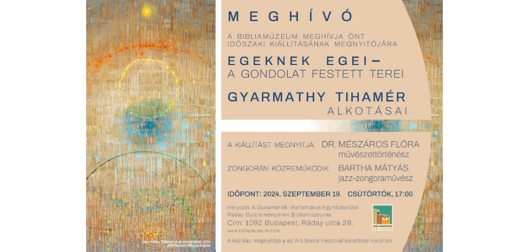 Gyarmathy Tihamér festőművész életművéből mutat be válogatást a Bibliamúzeum új időszaki kiállítása. A tárlaton két szinten több mint félszáz alkotás tekinthető meg. Néhány korai, figuratív művet követően a művész háború után készült festményei kerülnek előtérbe, továbbá kortársainak néhány műve is látható.