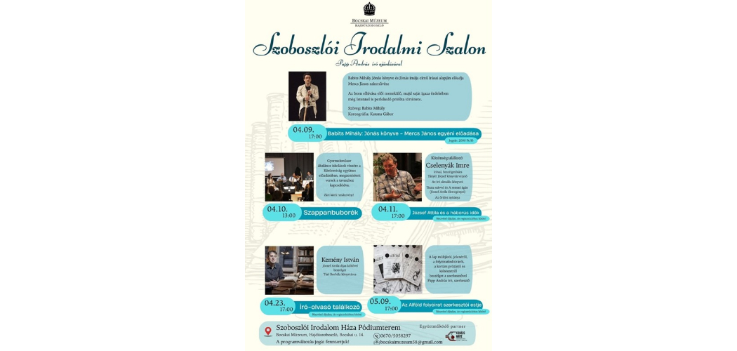A programkínálatból kiemelkedik a magyar költészet napjához kapcsolódó, egy hónapon át tartó rendezvénysorozat, amelynek helyszíne az Irodalom Háza volt. A Szoboszlói Irodalmi Szalon eseményei során a közönség monodrámát, megzenésített verseket, író–olvasó találkozókat és beszélgetéseket is hallhatott, a programsorozatot pedig az Alföld folyóirat szerkesztőivel folytatott szakmai beszélgetés zárta. A rendezvény jól példázza, miként kapcsolódnak össze az irodalmi hagyomány, a kortárs reflexió és a közösségi jelenlét az intézmény gyakorlatában.