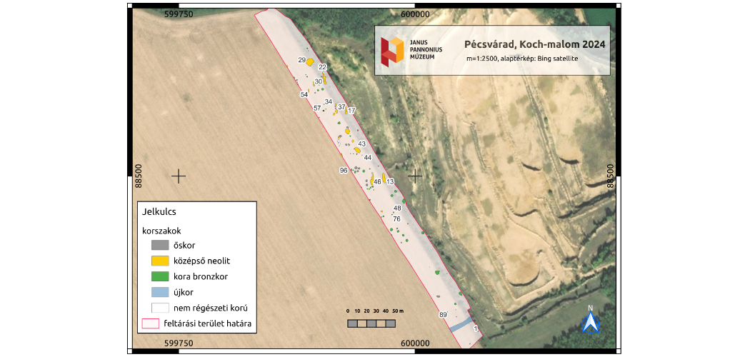 Majdán Mira tanulmányában bemutatott lelőhely térképe, a korszakok és a szövegben kiemelt objektumok megjelölésével. Térkép: Szabó Tibor, JPM