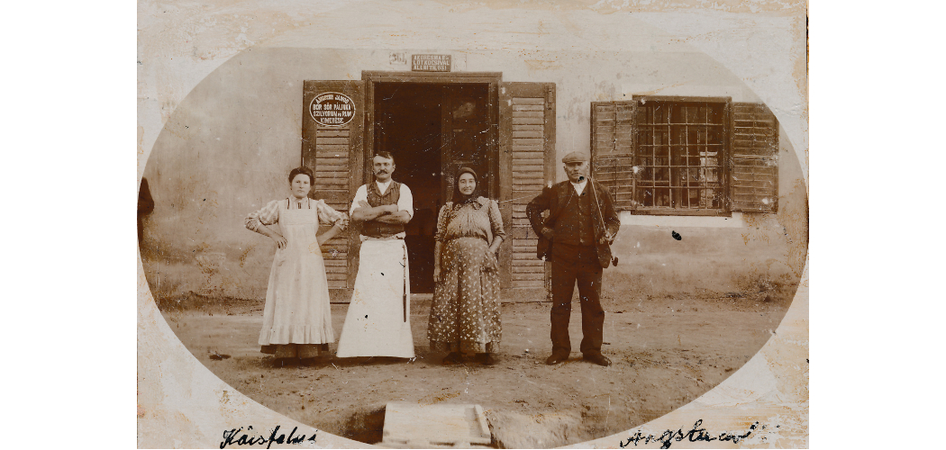 Angster Johann/János a feleségével, Catharinával és Ferenc fiuk a feleségével, Rozáliával a kácsfalui nagyvendéglő előtt