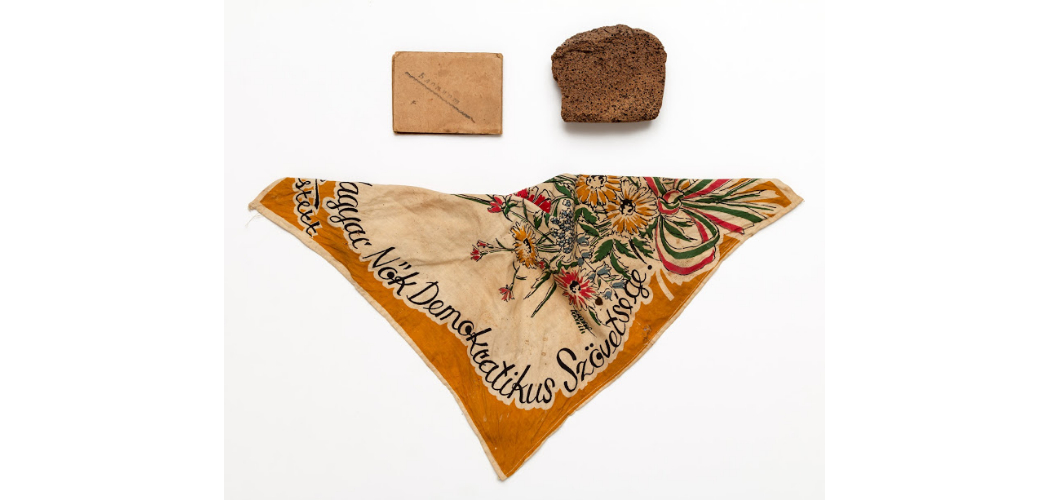 Csikóstöttösről elhurcolt nő „málenkij robotos” hagyatéka. A hazafelé vezető úton, 1949-ben íródott jegyzetfüzete, egy darab kenyér és a hazajövetelekor Debrecenben kapott üdvözlő kendő (JPM Új- és Legújabbkori Gyűjteményi Osztály, fotó: Füzi István)