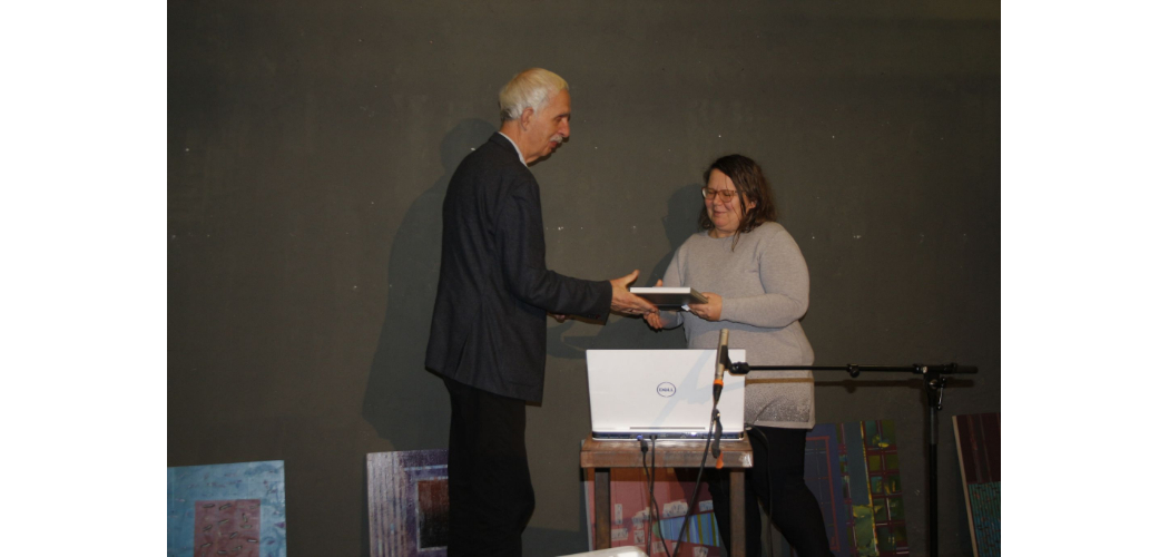 Feld István átveszi szerzői kötetét a Martin Opitz Kiadó képviselőjétől, Bertók Krisztinától a Fugában