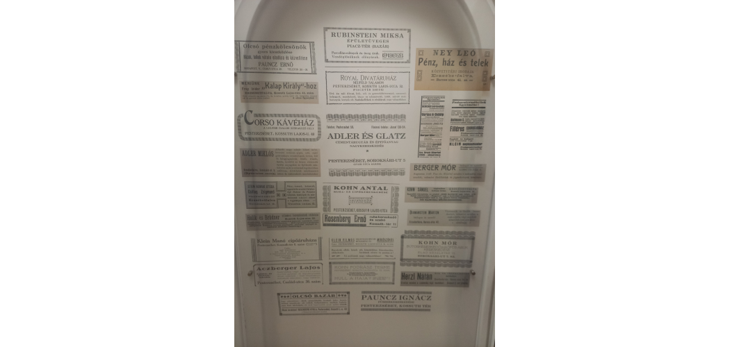 A kiállításon látható reklámok jól érzékeltetik a zsidóság szerepét a helyi ipar és kereskedelem működésében. Divatáruházak, kalapműhelyek, cipő-és ruhaáruházak, bútoráruházak, fűszerkereskedések mellett cementgyár, építőanyag nagykereskedés tulajdonosai voltak a jelentős adót fizető zsidó polgárok. De a szolgáltatások és pénzügyek terén is aktívak voltak; az előbbiekhez sorolhatók a kávéházak, az utóbbiak legjelentősebb megnyilvánulásaia pénzügyi szolgáltatások és az ingatlankereskedelem.