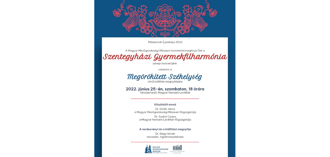 A Magyar Mezőgazdasági Múzeum a 2022. évi Múzeumok Éjszakája központi programjaként hangversenyt és kiállítást rendez. Ezen az estén megnyitjuk a Megörökített székelység című kiállítást. A rendezvényt és a kiállítást Dr. Nagy István agrárminiszter nyitja meg.