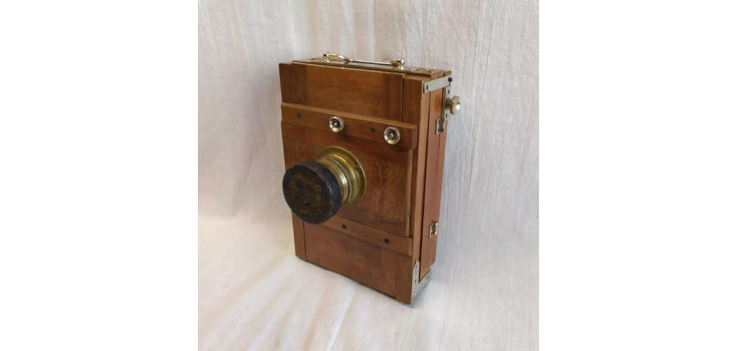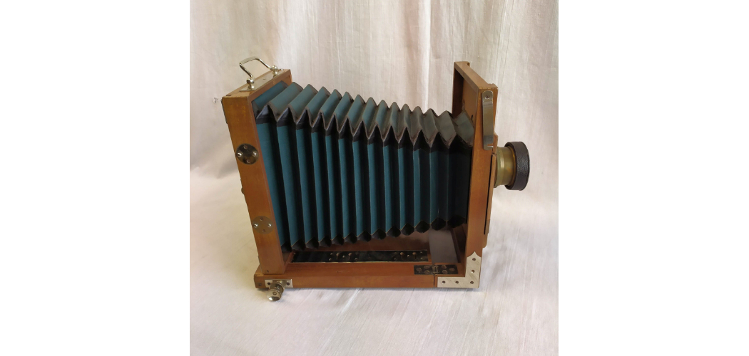 Elődeink közel száz évvel ezelőtt ilyen harmonikás fényképezőgépet használtak. A műtárgy a Zala megyei Pákáról került a Göcseji Múzeum gyűjteményébe. Az ajándékozó bátyja, Balog János használta, s valamikor 1928-30 körül vásárolta. A fényképezőgép Dark Red Meranti fából készült, polírozott és összecsukható. A német gyártmányú gép harmonikája zöld-fekete impregnált vászonból készült, a fémrészek nikkelezettek. Szétnyitva három nagyobb részből áll: a talprész kettős huzatú, két oldalán csavarral mozgatható. Az alján csavarmentes lyuk is látható, melyhez adott esetben a láb illeszthető. A hátsó részhez illeszkedik a harmonika egyik vége, az első részhez pedig az objektív. A fényképezőgép külön érdekessége pedig az, hogy még fekvő képet is lehetett vele készíteni.