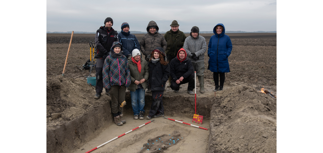 A Türr István Múzeum csoportunk a sír feltárásánál: Pap Evelin, Pásztor Emília és Cs. Andrási Réka régészek, Szalontay Bálint, Sultis László, régésztechnikusok, Dömötör József, Sultis Tibor, Kovács Gábor valamint Juhász Péter Érsekcsanád jegyzője, és N. Kovács Zita igazgató