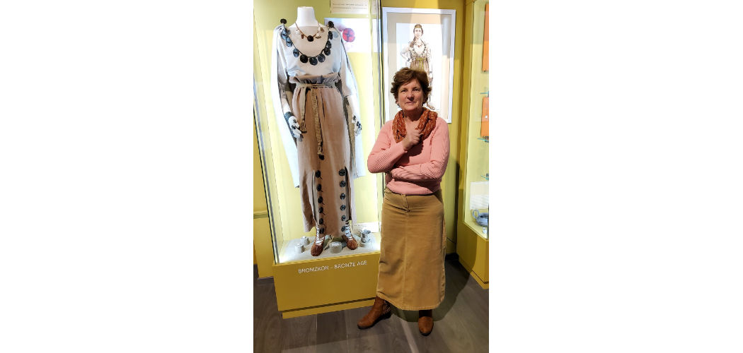 Dr. Pásztor Emília és a sír leletei alapján készült bronzkori viseletrekonstrukció a Türr István Múzeum új állandó kiállításán