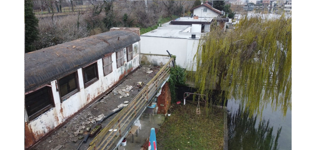 A fotókon jól látható, hogy milyen döbbenetes állapotban, egy tóparti ház emeleti szintjeként, befalazva találtak rá a múzeumi értékű járműre, a szlovákiai Szencen.