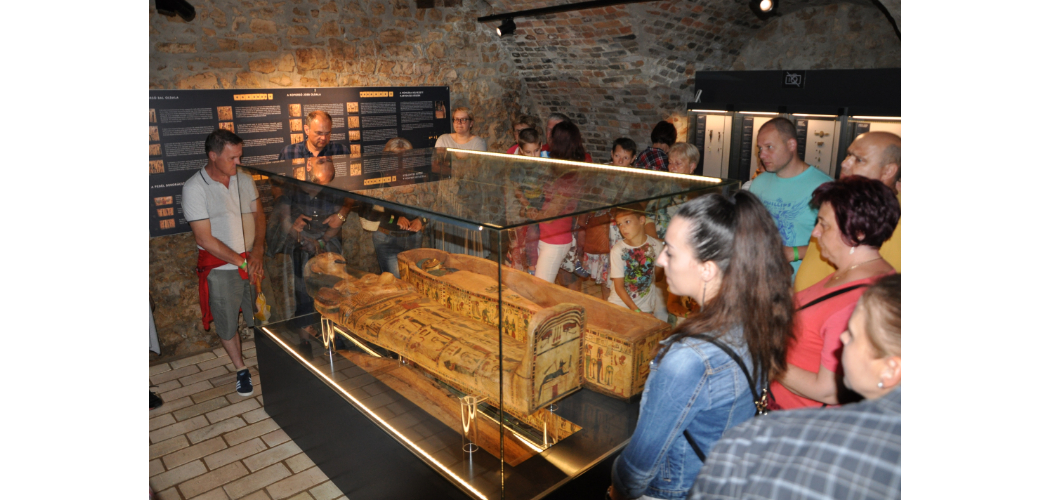 A két részre osztott helyiség belső felében sejtelmes félhomály uralkodik. A falra vetítve egy korabeli sírfeltárás felvétele látható. A pince legbelső részébe érve tárul elénk a világviszonylatban is kuriózumnak számító, rendkívül gazdagon díszített koporsó benne az 500-600 évvel későbbi időből származó múmia.